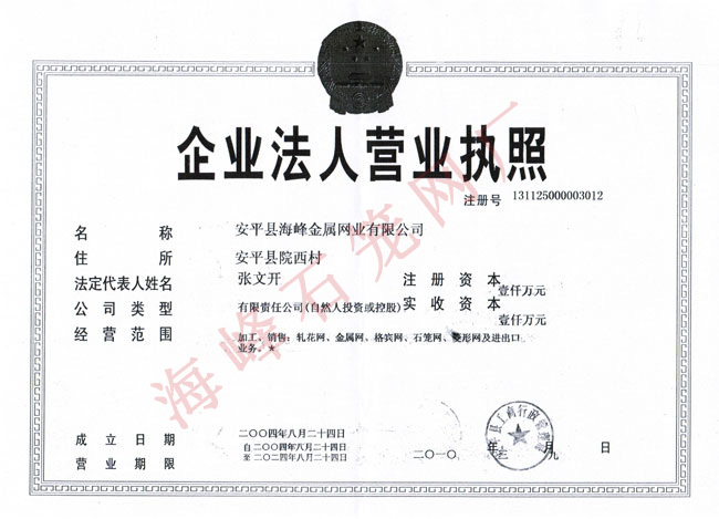 - 安平縣海峰金屬網(wǎng)業(yè)有限公司 安平縣海峰金屬網(wǎng)業(yè)有限公司位于中國著名的“絲網(wǎng)之鄉(xiāng)”——河北省安平縣,是具有拉絲織網(wǎng)、焊接、剪裁、噴塑、浸塑成品等一整套生產(chǎn)工藝的專業(yè)化廠家。本公司經(jīng)過多年來的順勢發(fā)展,現(xiàn)已擁有廣闊的生產(chǎn)廠房和優(yōu)良的辦公環(huán)境,占地8500平方米,在廠職工100余人。擁有高深的技術(shù)人員,高端的生產(chǎn)設備,全自動的機械化生產(chǎn)流水線,站在了軋花網(wǎng)、石籠網(wǎng)同行業(yè)的頂端。 查看更多>>